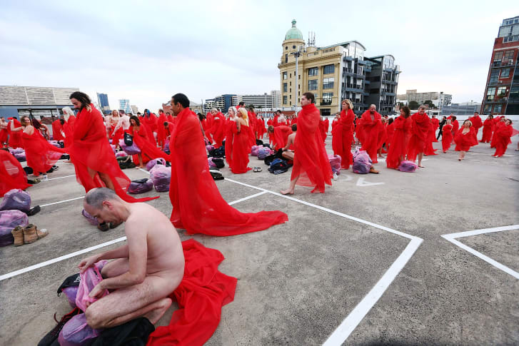 “Artist spencer tunick has staged more than 75 large-scale installations comprising hundreds or thousands of nude participants in both urban and natural settings across the globe. however, in order to share his art on instagram and facebook, he is tasked with meticulously censoring himself by individually blurring each and every nipple and, even when he does, the photographs are often flagged and eventually removed. ‘the work I’m allowed to post is fundamentally different from the work I make,’tunick explains. ‘to me, every pixelated nipple only succeeds in sexualizing the censored work. as a 21st century artist, I rely on instagram. it’s the world’s magazine and to be censored on it breaks my spirit.’ At sunrise on june 2, 2019, tunick gathered 125 people to pose nude in front of facebook and instagram’s headquarters in new york city for the national coalition against censorship’s (NCAC) #wethenipple campaign. participants in the art action challenged social media censorship by covering their nipples with stickers of photographed male nipples — an act t0 ‘highlight the rigid — and anachronistic — gender inequality in existing nudity policies’. the imagery celebrates the work of feminist artist micol hebron, who created a male nipple pasty in 2014 and encouraged fellow artists to use it to cover female nipples on social media”.